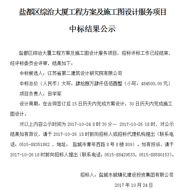 鹽都區(qū)綜治大廈工程方案及施工圖設計服務項目中標結果公示