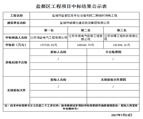 鹽城市鹽都區(qū)老年社會福利院二期臨時用電工程中標結(jié)果公示